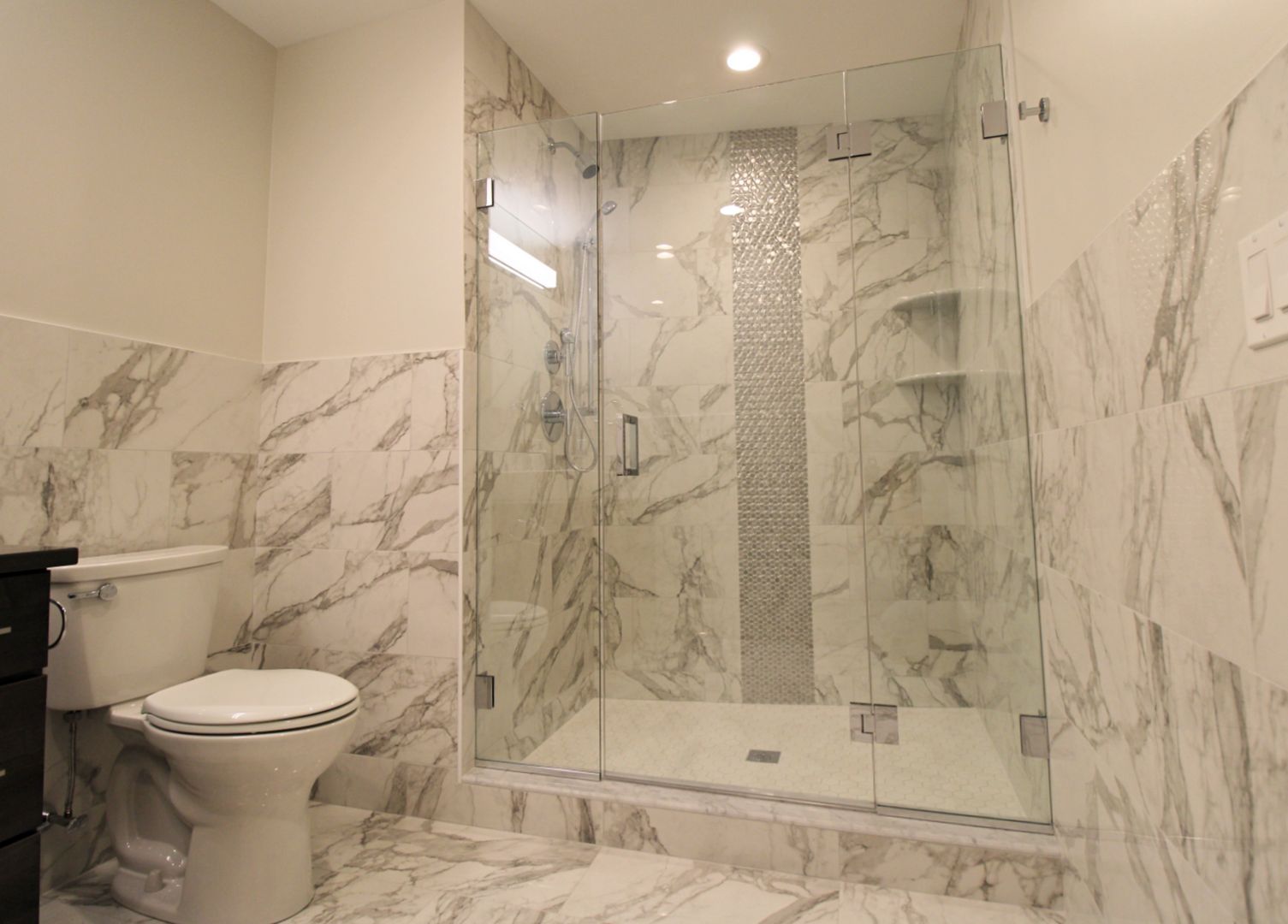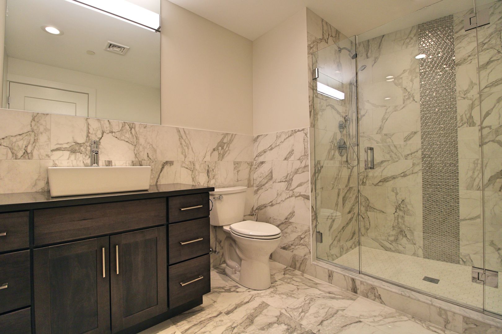 Corner unit apartment is beautifully designed with high end finishes. Kitchens fitted with custom cabinetry and quartz countertops. Bathrooms designed with walk in marble shower with glass doors. Enjoy a view of the city with floor to ceiling windows. 65 inch 4k LED Smart TV wall mounted in the living room. Living room windows fitted with room darkening shades. Bedroom windows fitted with blackout shades that block 99% of incoming light for a restful night’s sleep. Washer/Dryer in unit.