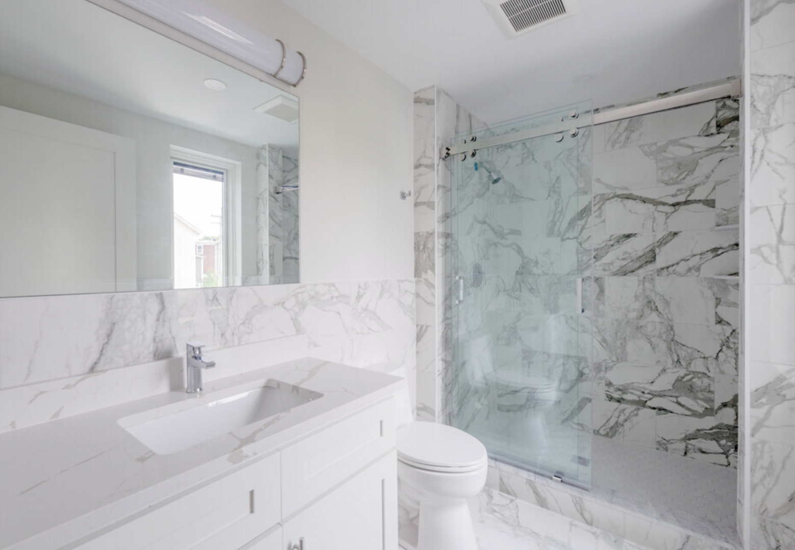 Tiles bathrooms with large walk in shower w/ glass doors.